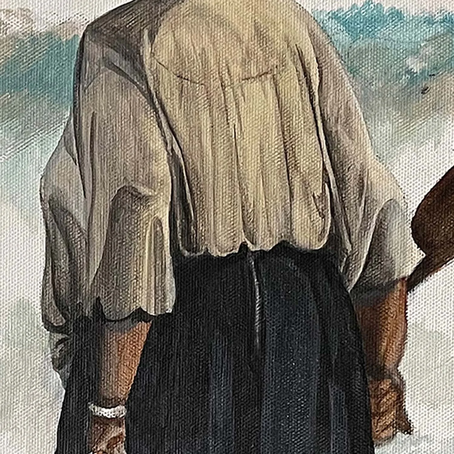 Then comes the studio work. From these sketches, contemporary figurative painting takes shape, expressed through a composition structured by the format of the canvas. The contemporary figurative painting is built through a precise dialogue between the body, space, and light.