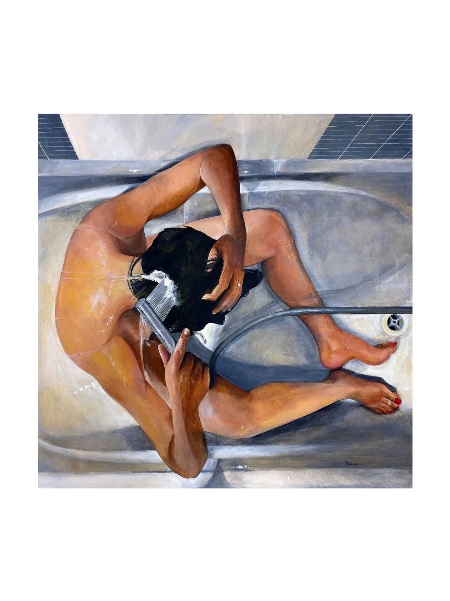 Je connaissais ce déroulé depuis de nombreuses années et je prends toujours autant plaisir à contempler son rituel. Bien souvent, je fais un croquis rapide de ses postures préalables. C’est aussi le cas pour l’oeuvre “Dos nu” que j’ai peint après celle-ci, en me déportant légèrement sur la droite.