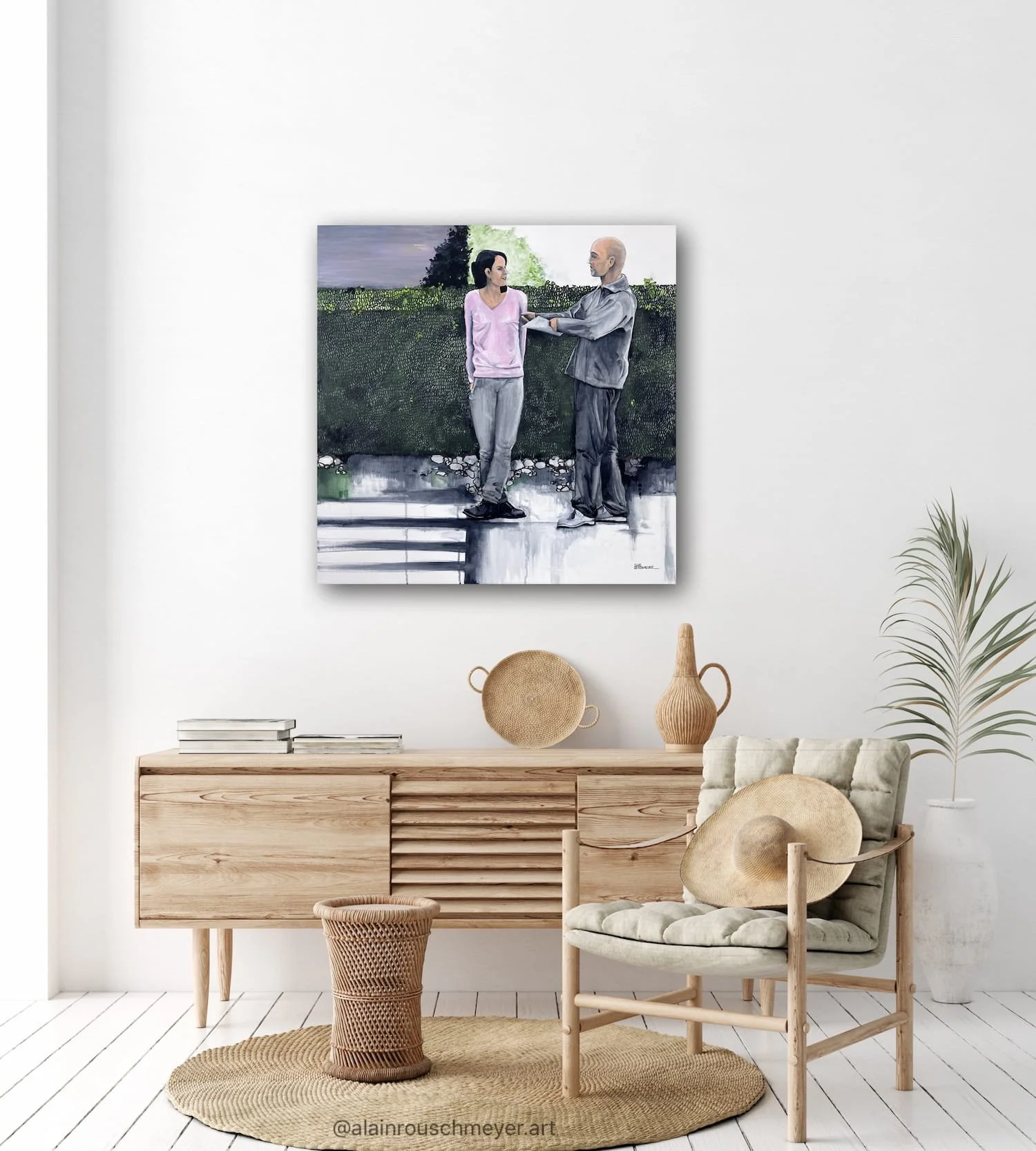 Then comes the studio work. From these sketches, contemporary figurative painting takes shape, expressed through a composition structured by the format of the canvas. The contemporary figurative painting is built through a precise dialogue between the body, space, and light.